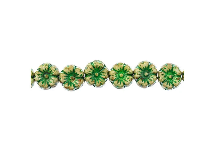 Czech Flower- Glass Bead Cinquefoil Flower Bead - 9mm - Dark Green on Alabaster White (Strand Apx 22pcs)