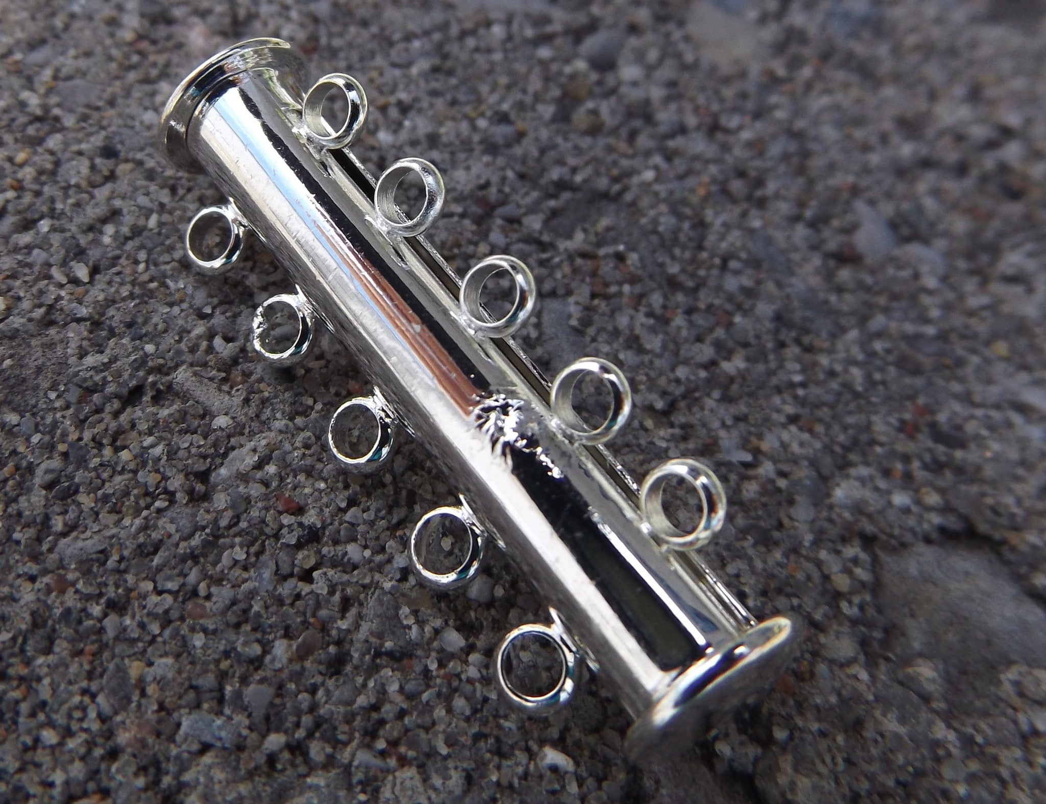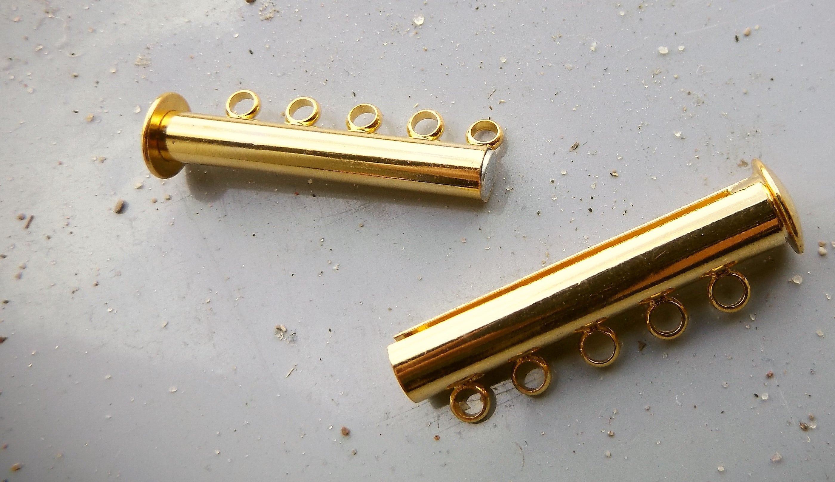Base Metal 5 hole Slide Lock Clasps.  Two parts which "slide" into each.  Magnet inside the finding to pull the pieces together.  Beautiful for many different applications. See drop down for options.  30mm Length.  Sold per 2 clasps