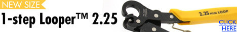 1 Step Looper. Create and trim loops in one easy step! Works with dead soft or half hard precious metal wire, craft wire, and copper or brass core wire. Makes a consistent size 2.25MM loop every time. Bends and trims between 24 and 18 gauge wires. Allows beaders to customize the length of eye pins. Patent protected.