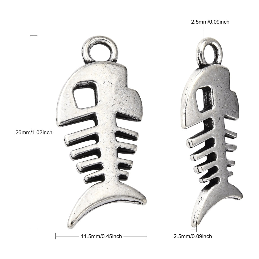Fish Bone Metal Charm, Antique Silver Color, 26x11.5x2.5mm, Hole: 2.5mm. Sold Individually.