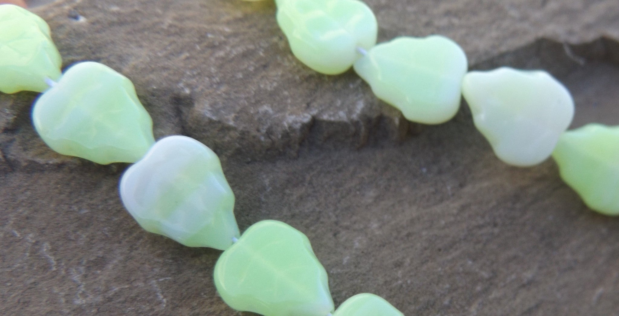 Czech Fire Glass LEAF Beads in Spring Green and Creamy White *25 Beads