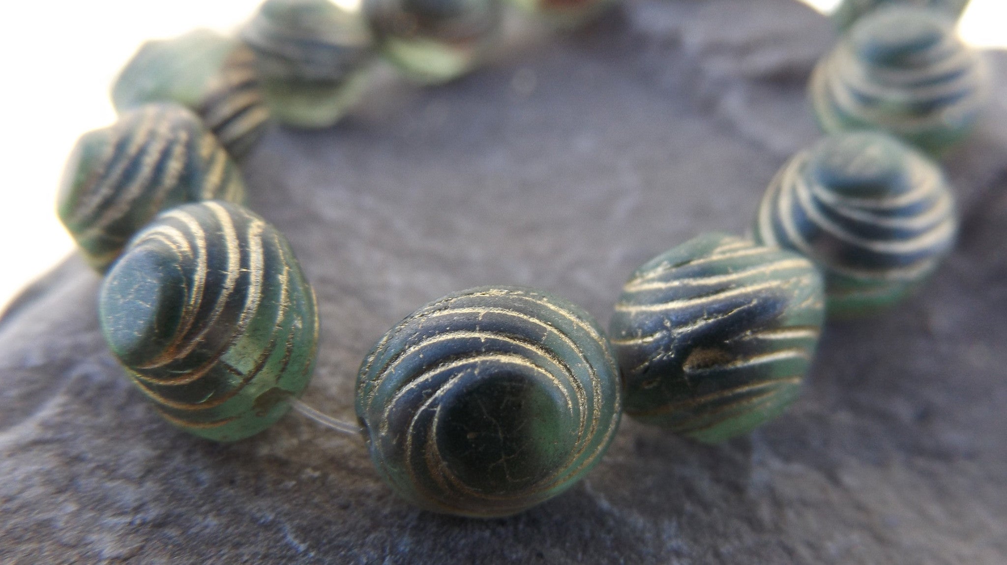 Czech Glass Beads (bean shape) in Deepest Green with Gold Stripe AB *15 Beads