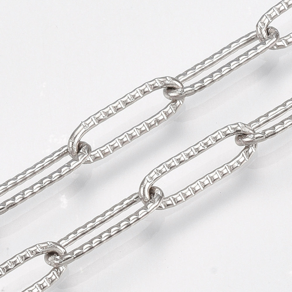304 Stainless Steel Paperclip Chains, Drawn Elongated Cable Chains, Soldered, Textured, Stainless Steel Color, 12.5x4x1mm Sold by the Foot