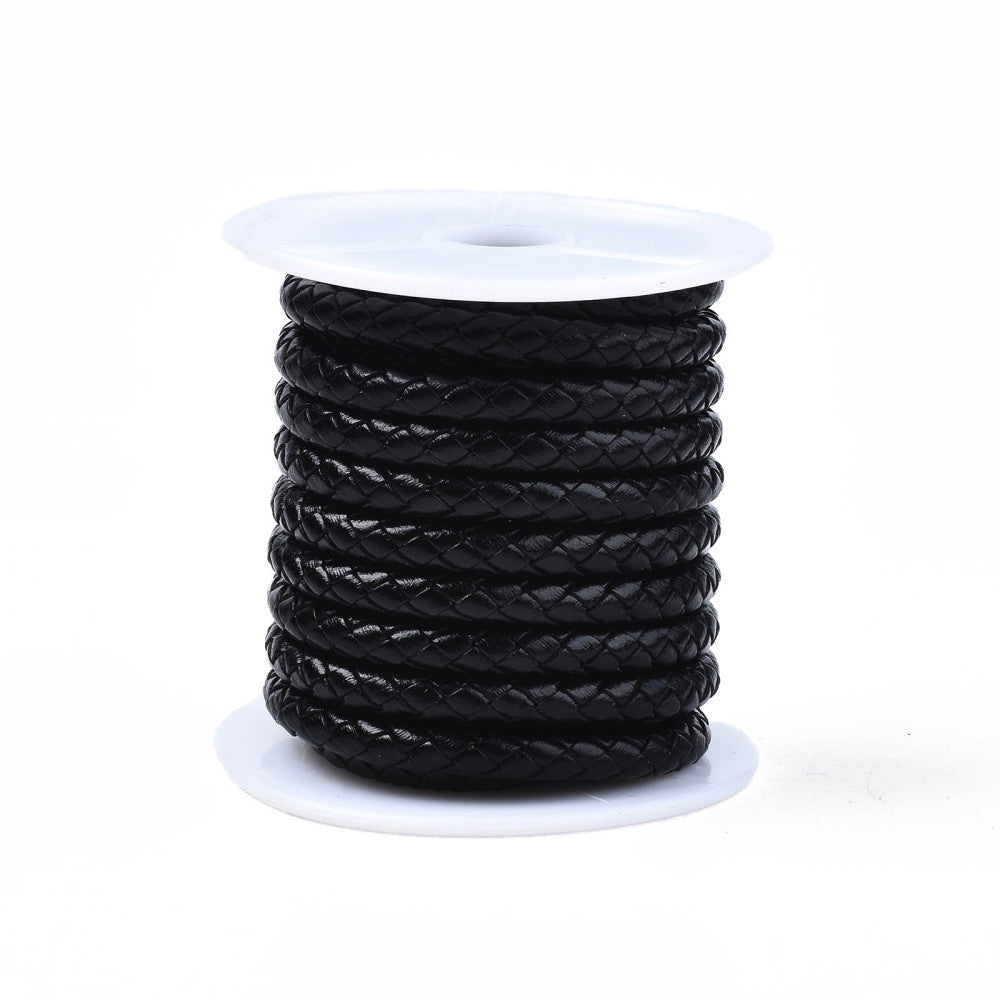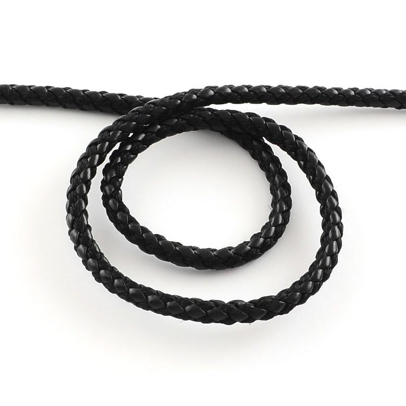 Braided Cowhide Leather Cord (Black). 5mm Diam. 4 Meters Roll.