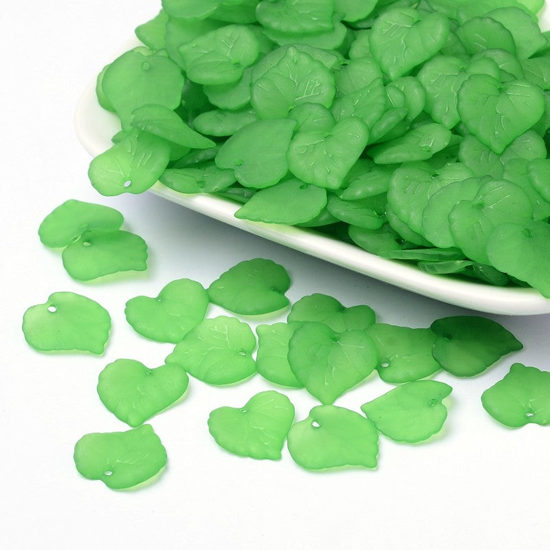 Transparent Acrylic Charms, Frosted, Leaf, Green, Dyed, about 16mm long, 15mm wide, 2mm thick, hole: 1.2mm, Packed 25 Leafs)