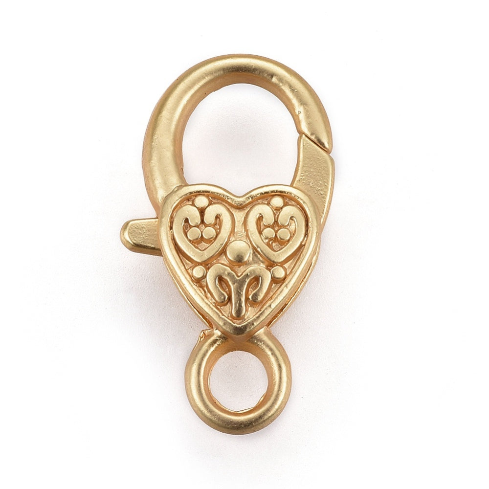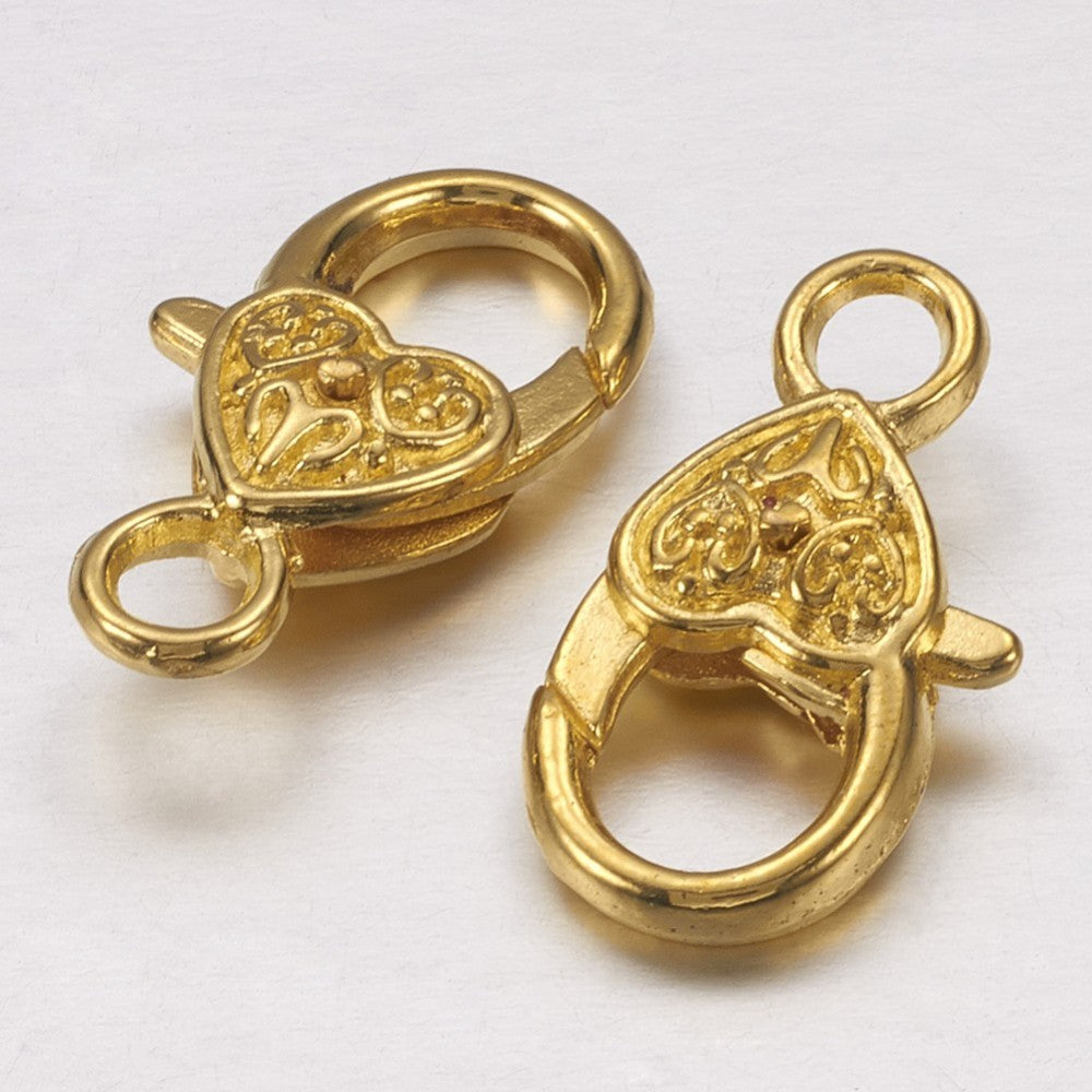 Base metal lobster clasp in goldtone  color.  Packed 2.  With Heart pattern center.  25.5 x 14mm.