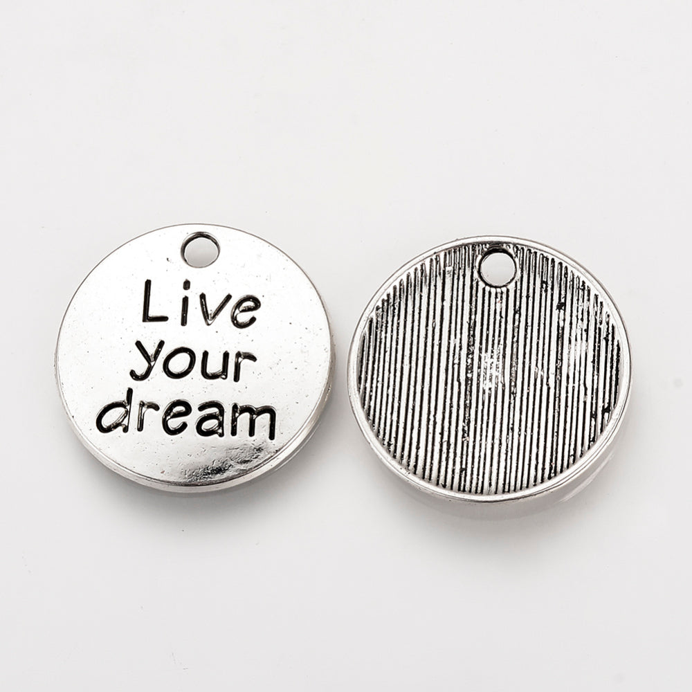 "Live Your Dream" Round Pendant/Charm. 20mm in diameter, 2mm thick, hole: 2mm. (See drop Down for Package Options)