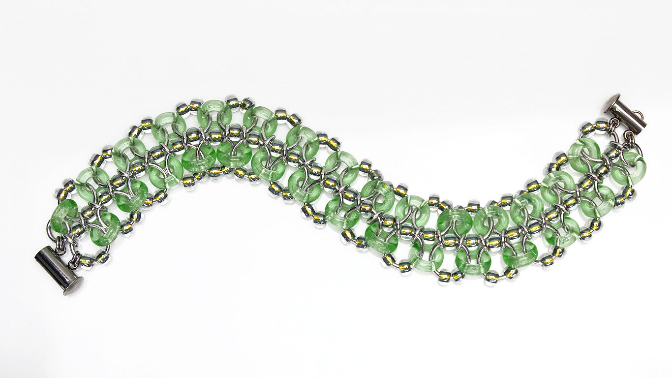 Two decorative strips of sparkling glass rings and beads intersect in a slightly zig-zag formation in this stylish bracelet. This pattern uses techniques from the Japanese style of weaving.