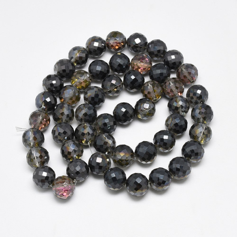 Electroplate Glass Beads Strands, Rainbow Plated, Frosted, Faceted, Round, Black, 12mm, Hole: 1.5mm, about 50pcs/strand, 22.05 inch