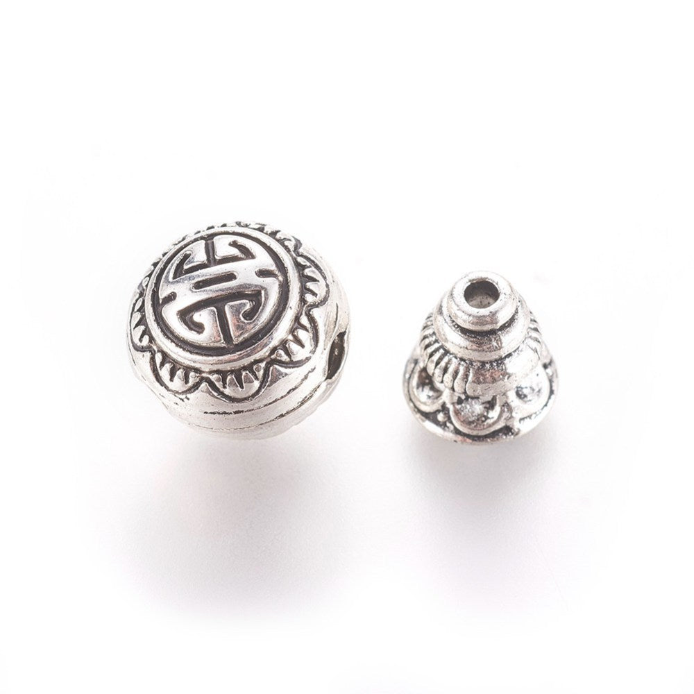 Tibetan Style Alloy Guru Bead Sets, T-Drilled Beads, 3-Hole Round & Buddha Head Beads, Antique Silver, 10mm, Hole: 2mm, Calabash Bead. (Packed 5 Guru Bead Sets)