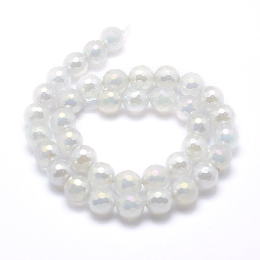 Electroplated Natural Agate, Round, Faceted, White, 10mm, Hole: 1mm; (Approx 40 Beads)
