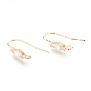 Brass Earring Hook, Ear Wire, with Horizontal Loop, Cubic Zirconia, Horse Eye, Clear, 18K Gold Plating. (Packed per pair)