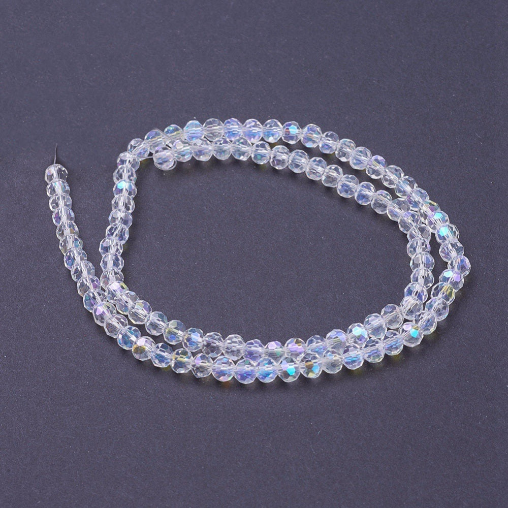 Glass Beads. AB Electroplate on Clear. (4mm Faceted Rounds). Approx 100 Beads.
