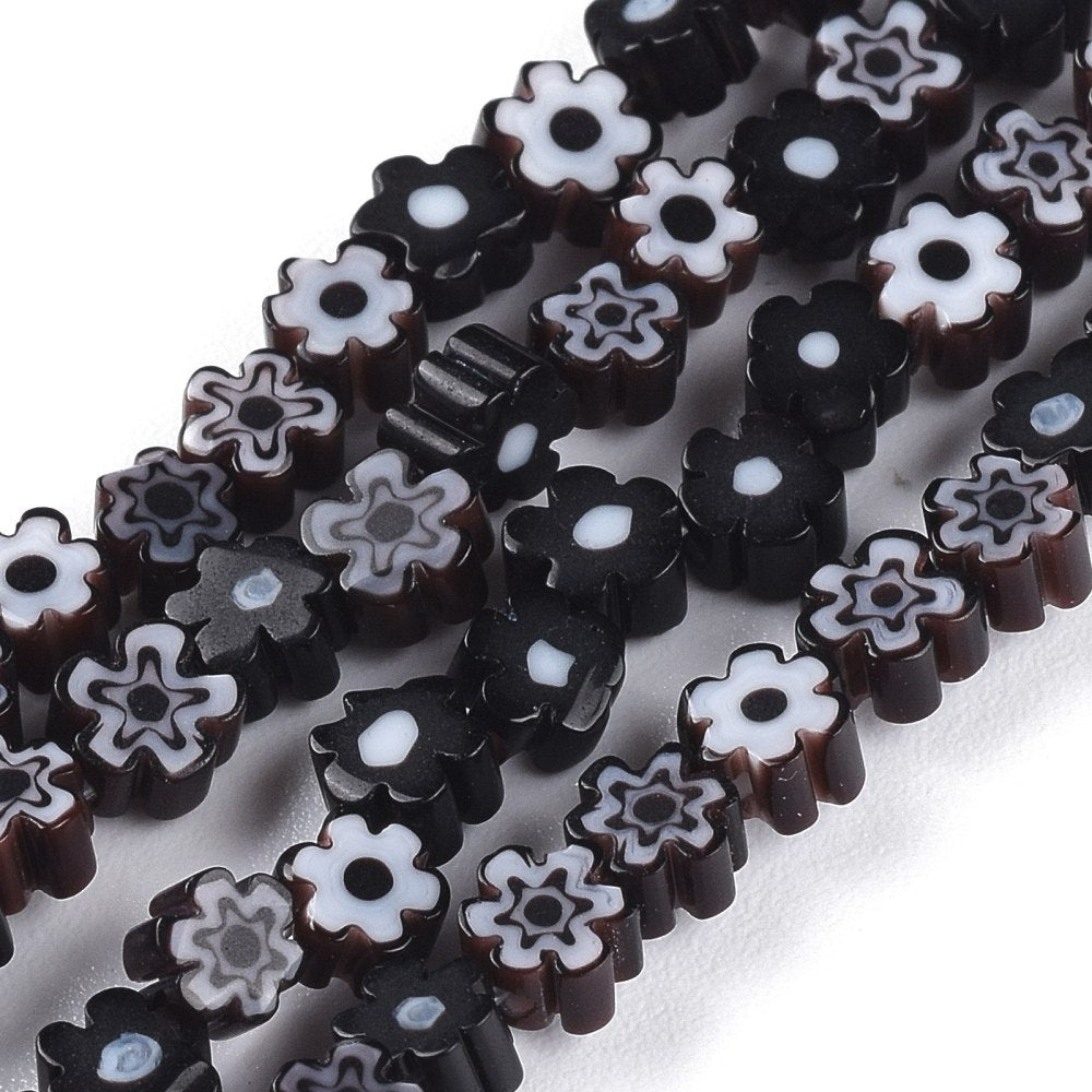 Hand-crafted Millefiori Glass Bead Strands, Flower, Black, 3.7~5.6x2.6mm, Hole: 1mm, about 88~110pcs/Strand, 15.75''(40cm)