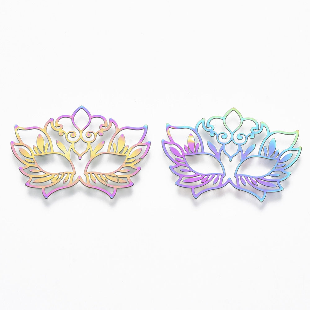 201 Stainless Steel Filigree Joiners Links, Etched Metal Embellishments, Mask, Rainbow Color, 25.5x33.5x0.4mm. (Packed 2)