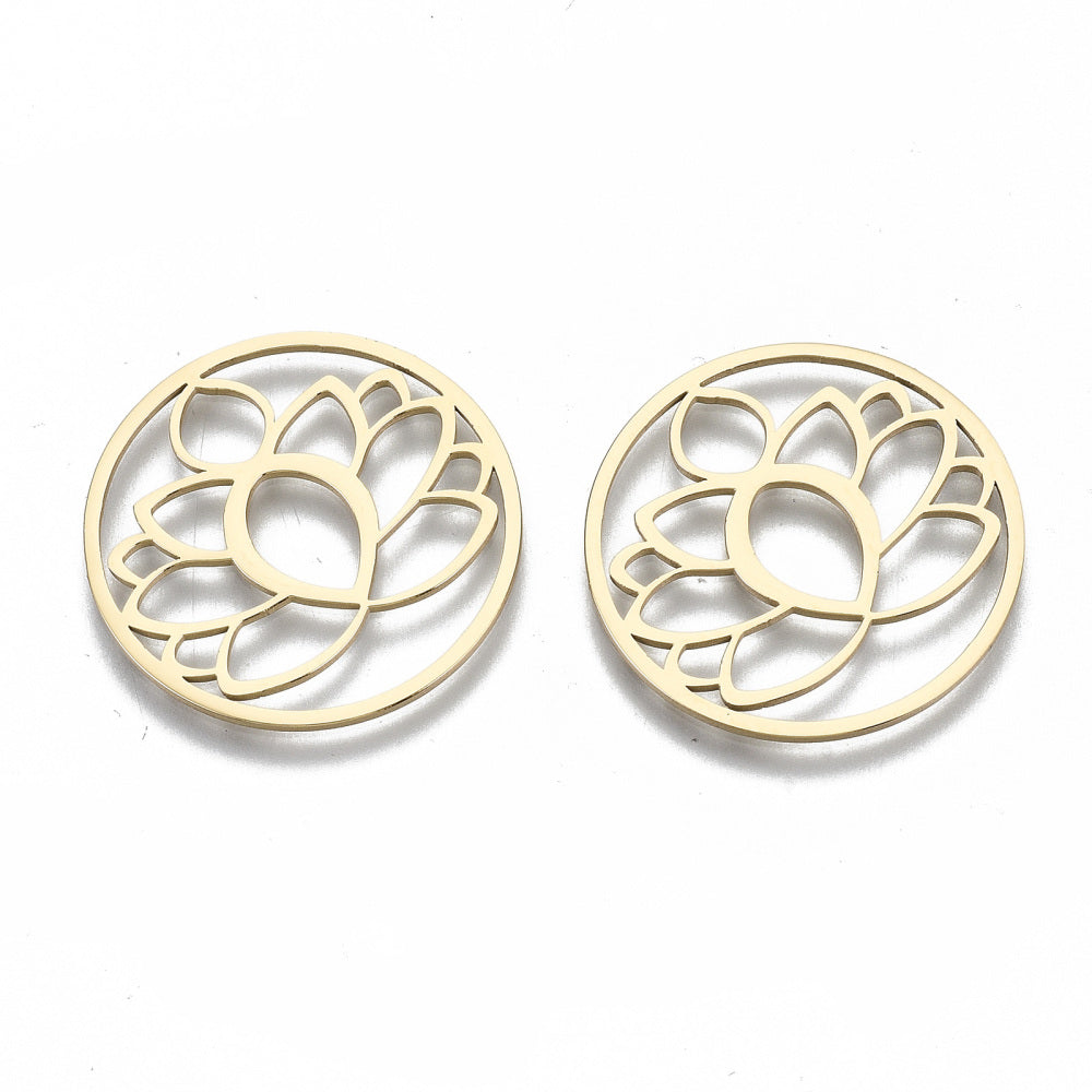 304 Stainless Steel Filigree Joiners Links, Laser Cut, Lotus, Real 14K Gold Plated, 25.5x1mm. (Packed 2)