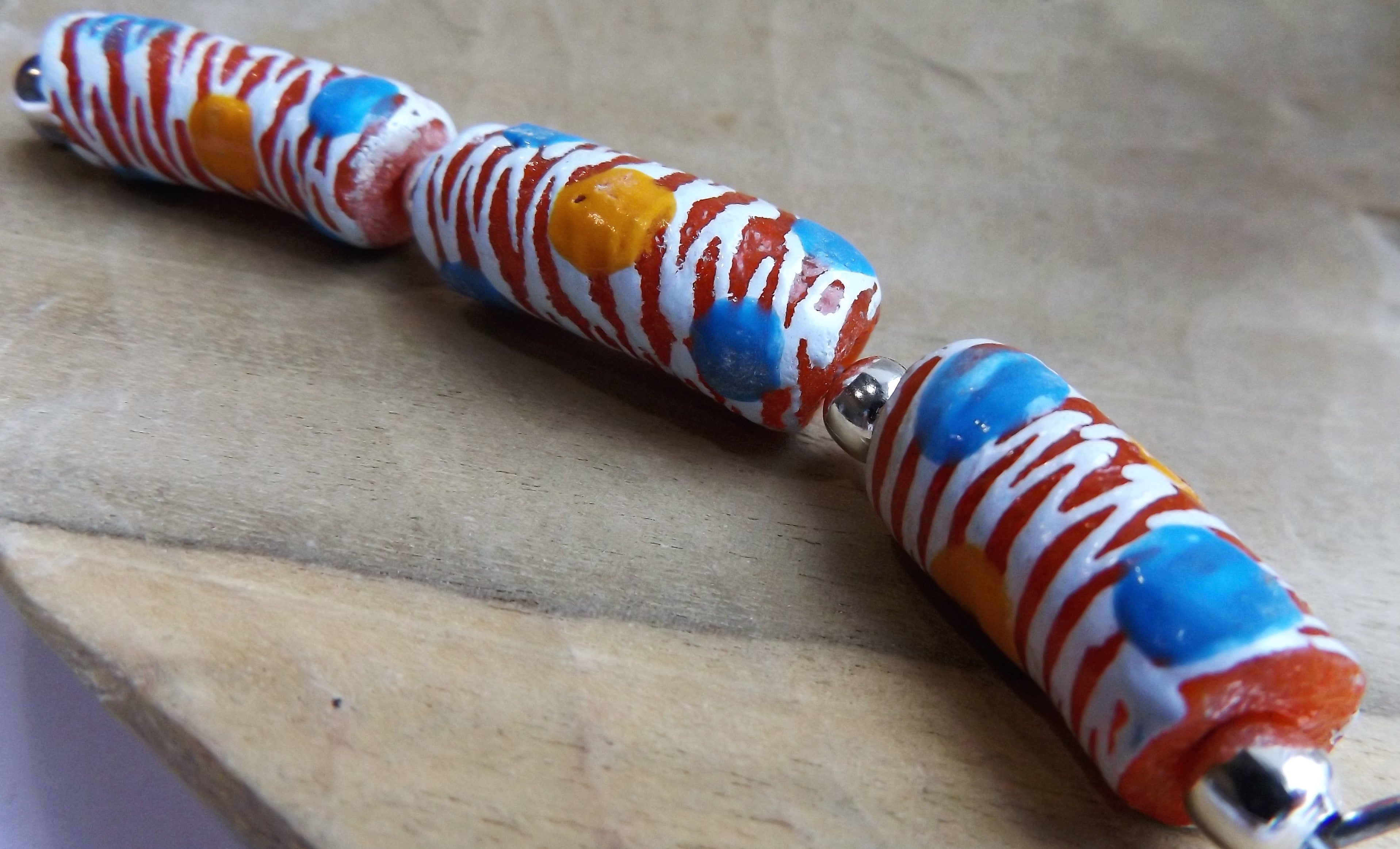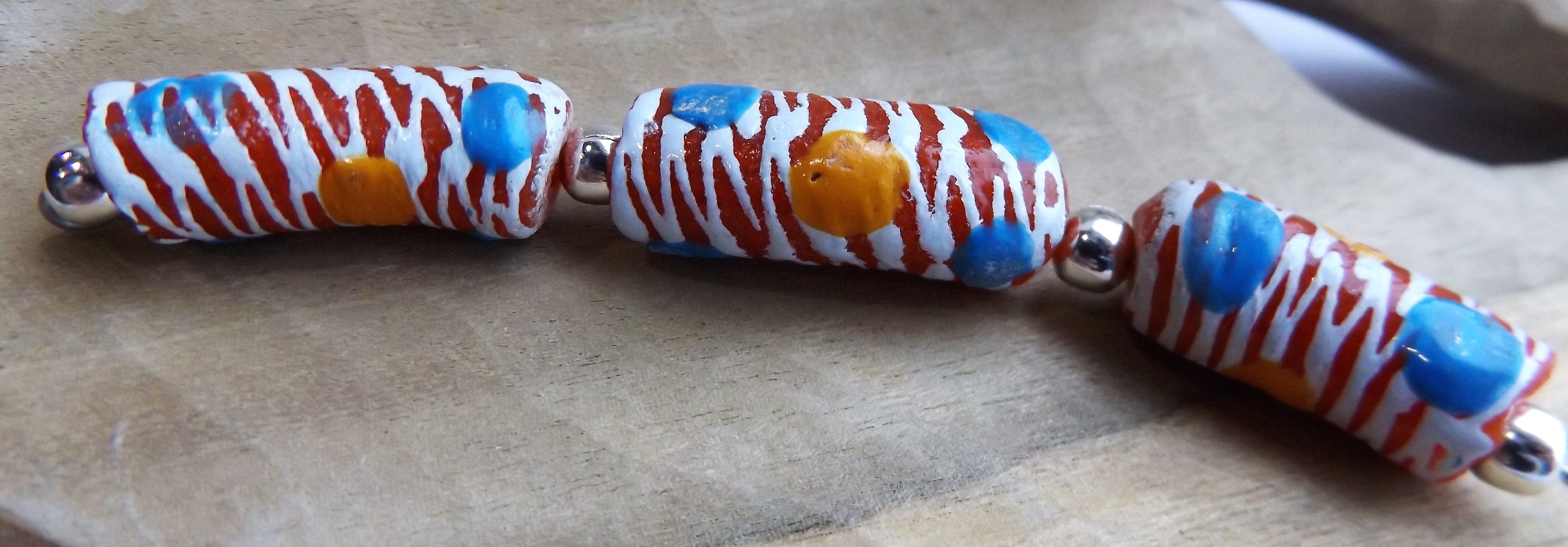 African Hand Painted Glass Tube Beads (Deep Sand Color with White. Blue and Yellow Dots) *3 beads
