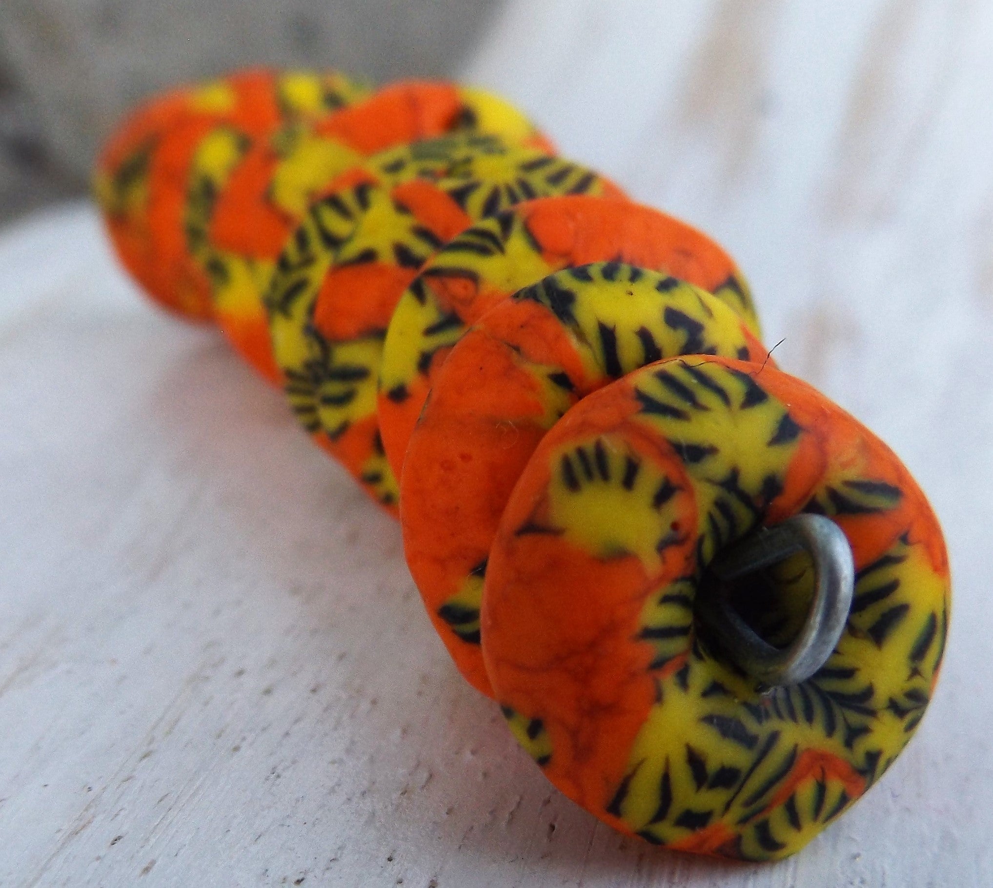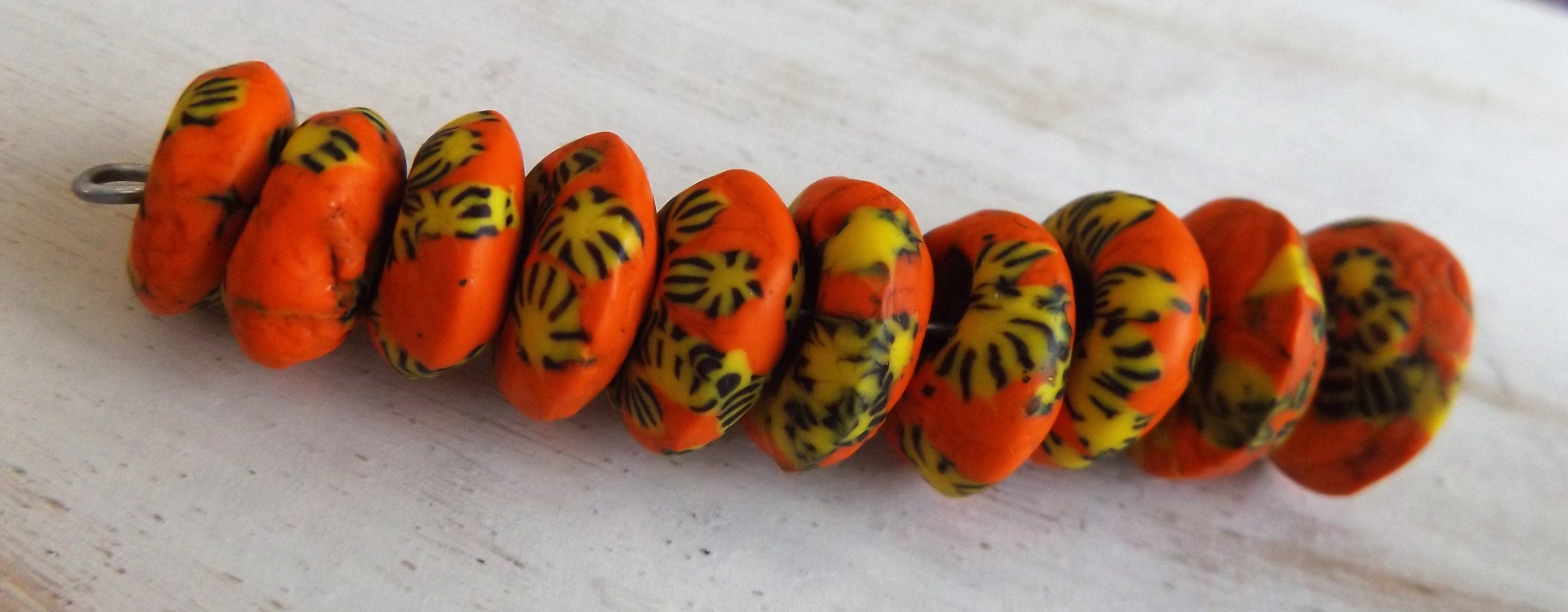 African Recycled Glass (Okata Beads) * Orange/Yellow/ Black (15mm Diam Size) *10 Beads