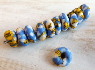 African Recycled Glass (Okata Beads) * White / Blue / Yellow and Black (15mm Diam Size) *10 Beads