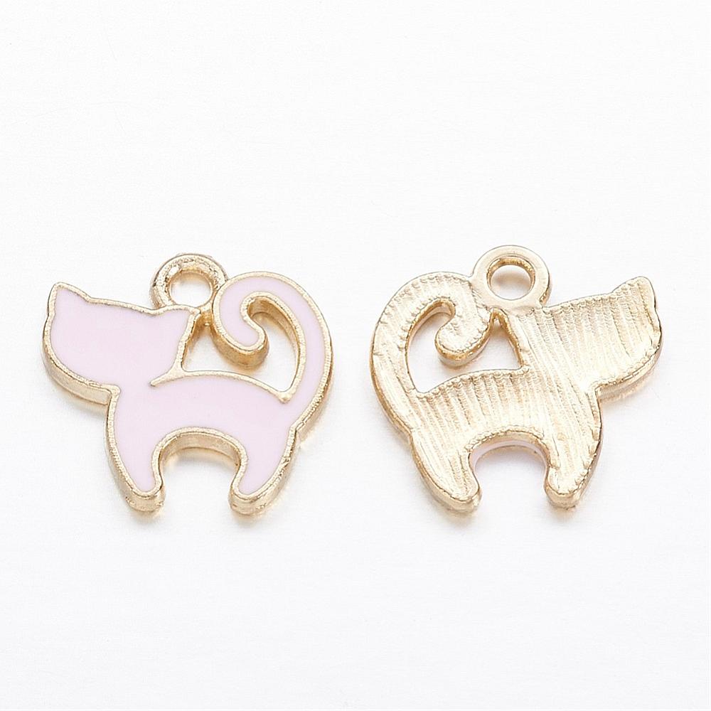 Alloy Enamel Kitten Charms, Cat Silhouette Shape, Golden with pink enamel, 12.5x13x1.5mm, Hole: 1.5mm(Sold Individually)