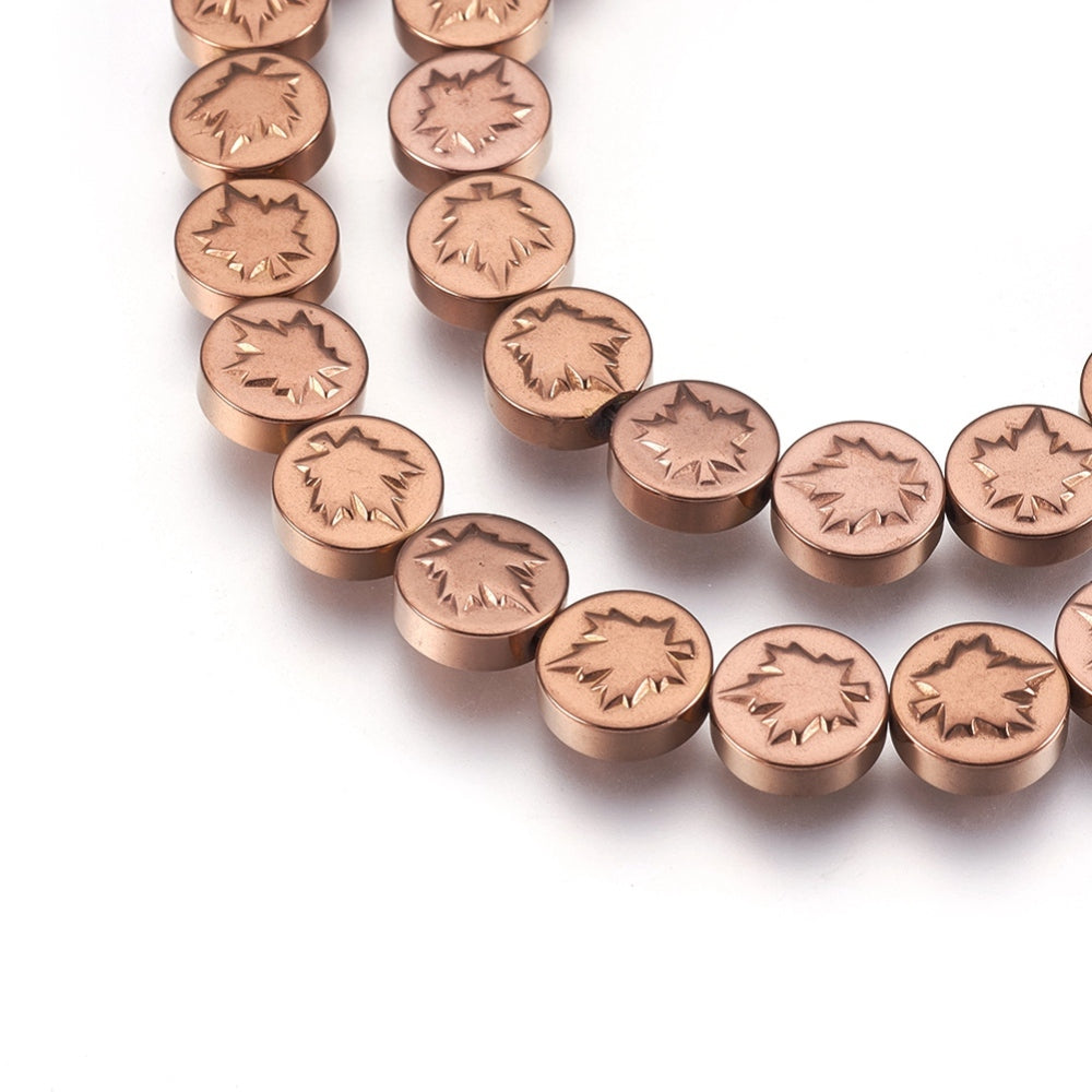 Autumn Theme Non-magnetic Hematite Bead Strands, Flat Round with Maple Leaf, Copper Plated, 9.5~10.5x4mm, Hole: 1mm, about 41pcs/strand, 15.9 inch(40.5cm)