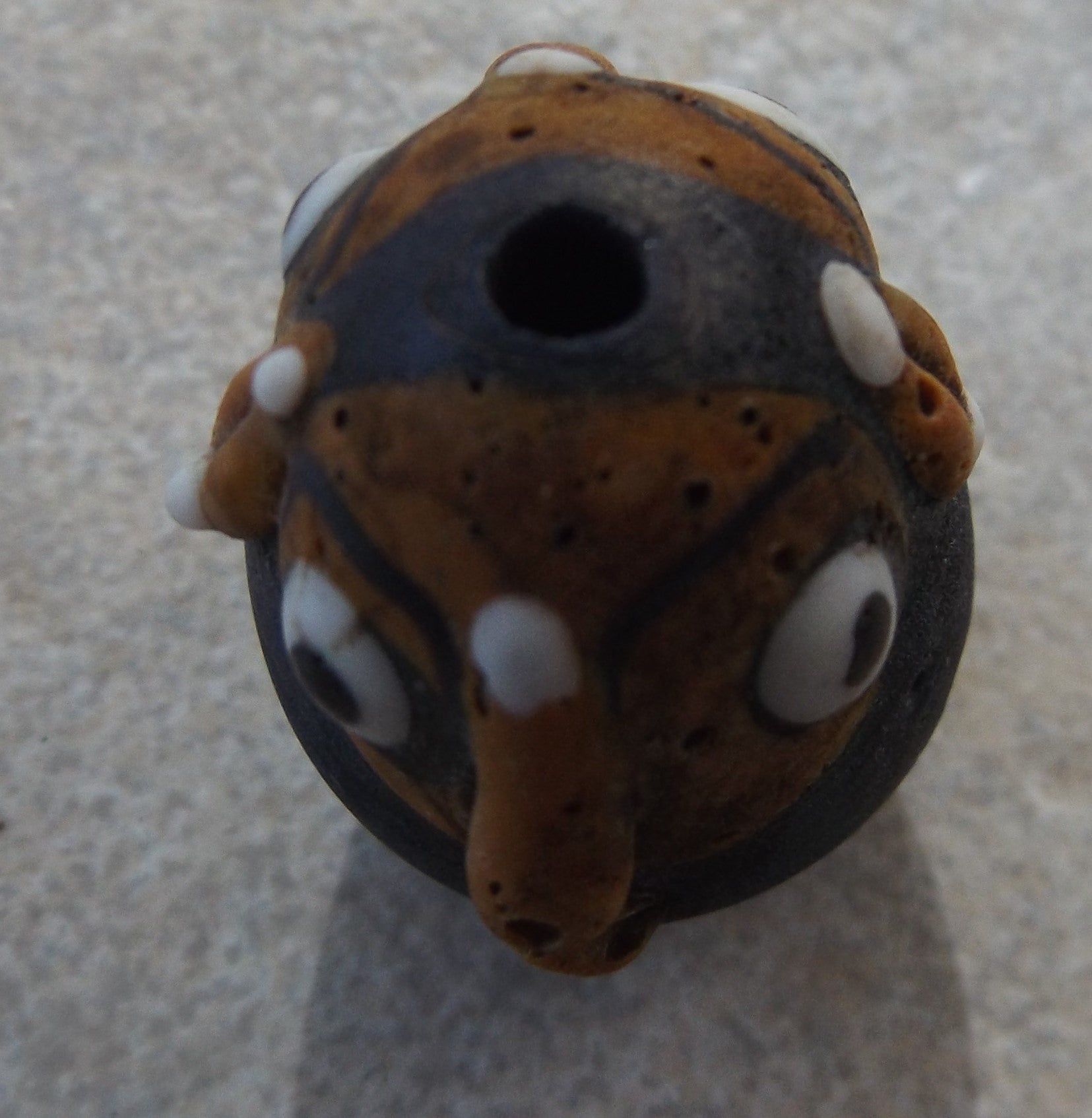 Hole drilled top to bottom  of the head.  Each bead is hand made therefore slightly different from each.  (ie may not be exactly as the photo).