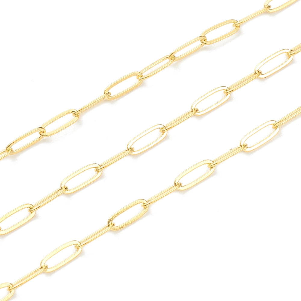 Brass Paperclip Chain, Flat Oval, Drawn Elongated Cable Chain, Soldered, Golden, 9x3.5x0.7mm *Sold By the Foot