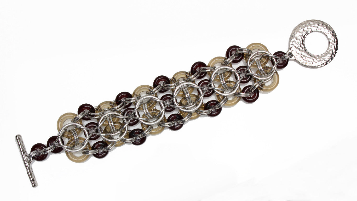 The Celtic Visions weave makes a rejuvenated appearance in this pattern with both large and small glass rings. The units are flipped 90 degrees and connected horizontally, which reminds me of a cross walk. This statement bracelet measures about 1" wide and features a large artisan-style toggle clasp.