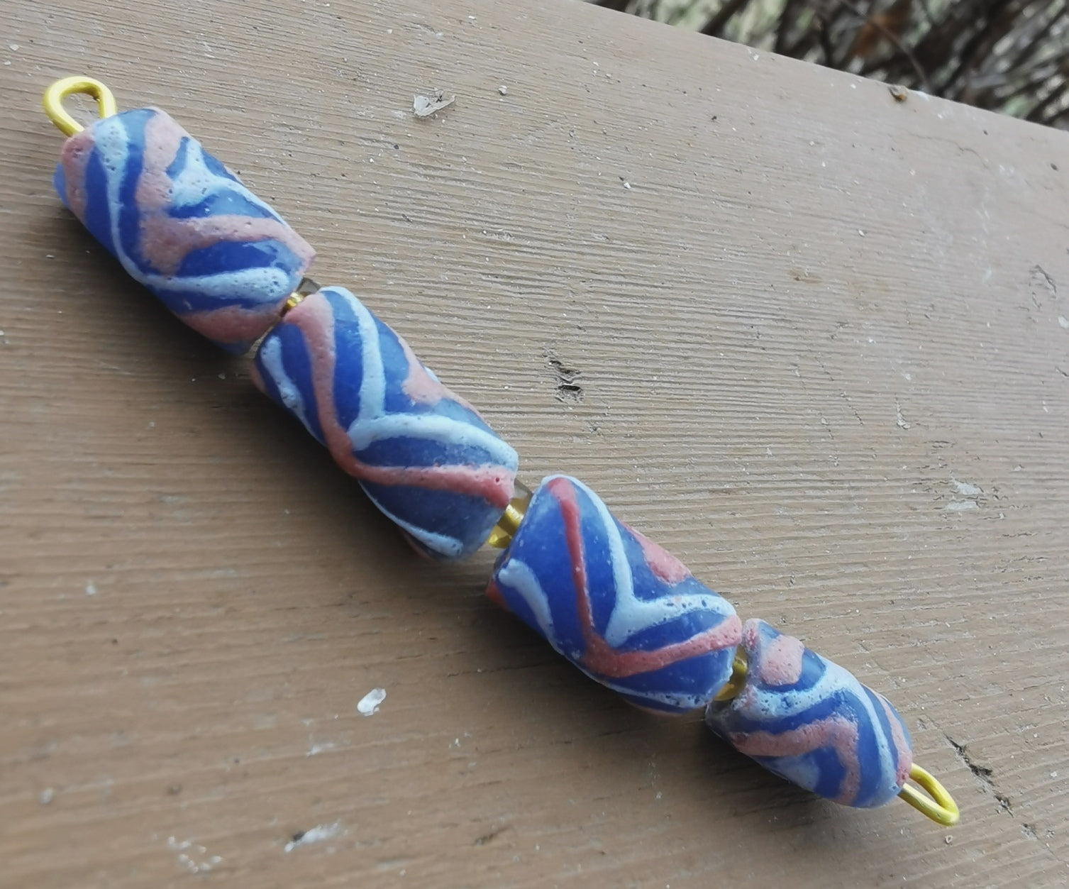 African Hand Painted Glass Tube Beads (Blue with Peach and White Chevron) *4 beads