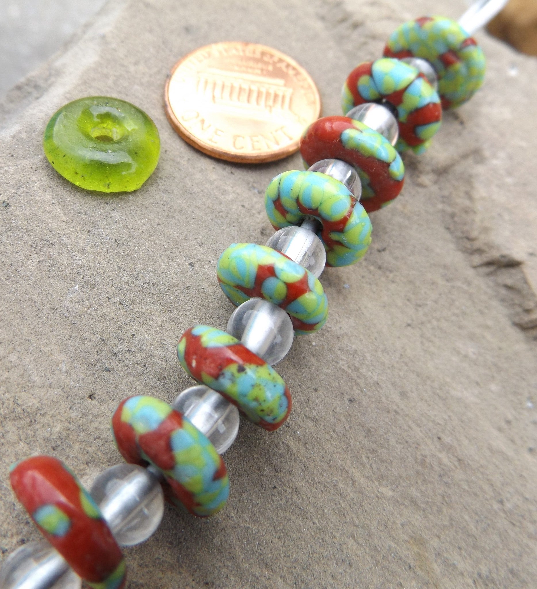 Otaka Beads are approx  10 -12mm in diameter x 3- 4mm in thickness approximately.  Due to the handmade nature of the beads, these sizes can vary slightly.   The green Okata Bead in the photo is for reference only as is the penny for sizing.  8 Beads per strand.  Free Spacer beads included (and will vary, not necessarily the spacers seen in the photos).