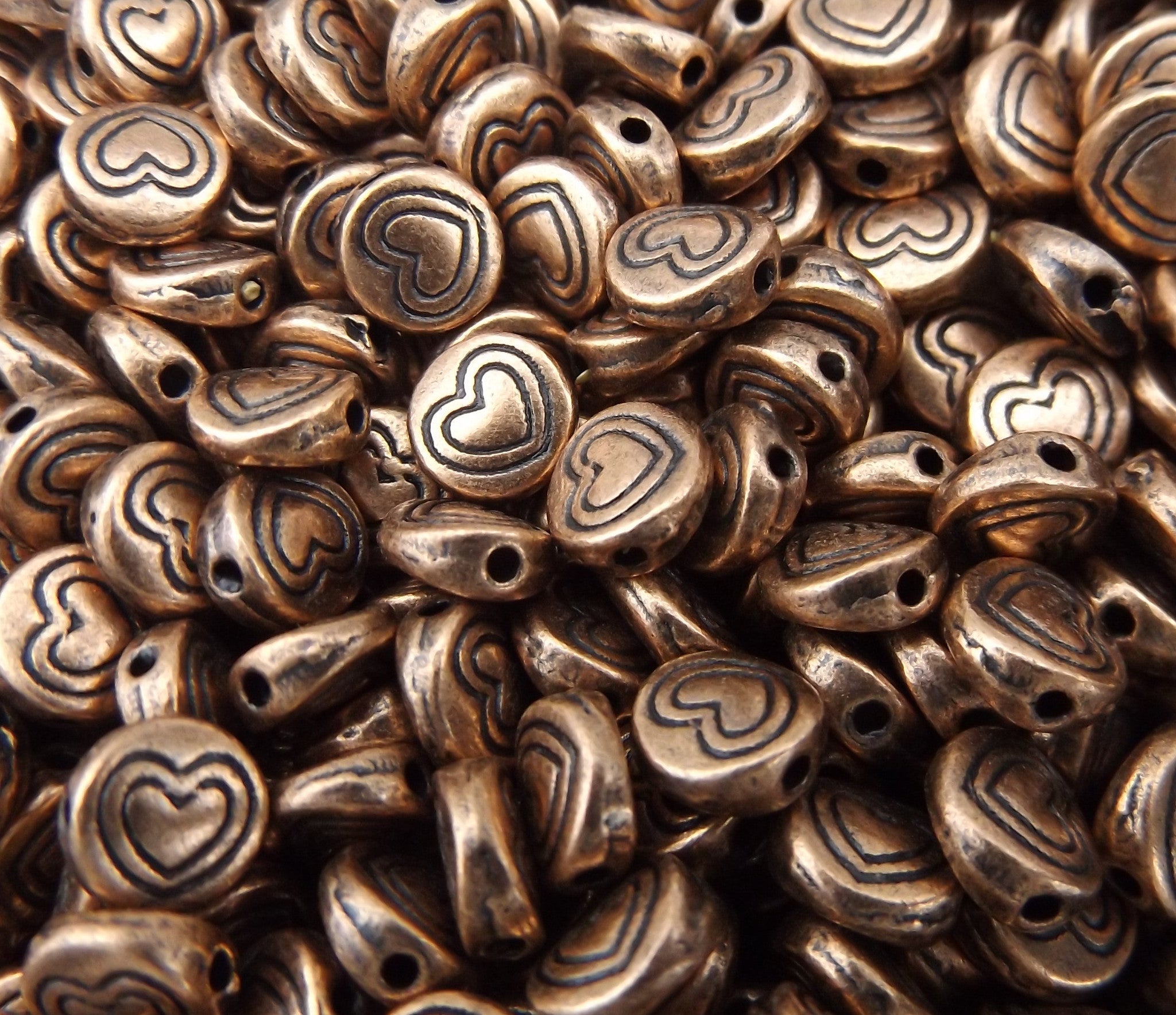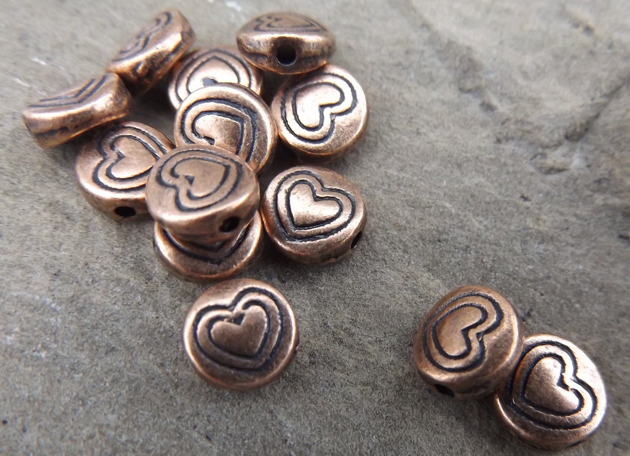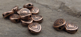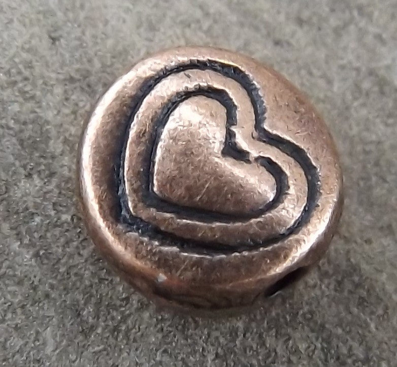 Tibetan Style Metal Beads. Flat Round with Heart (Red Copper Color), *Packed 50