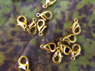 Base Metal Lobster Clasps with a bright Gold color finish.  Packed 12 (or bulk in 120).   9x6mm.