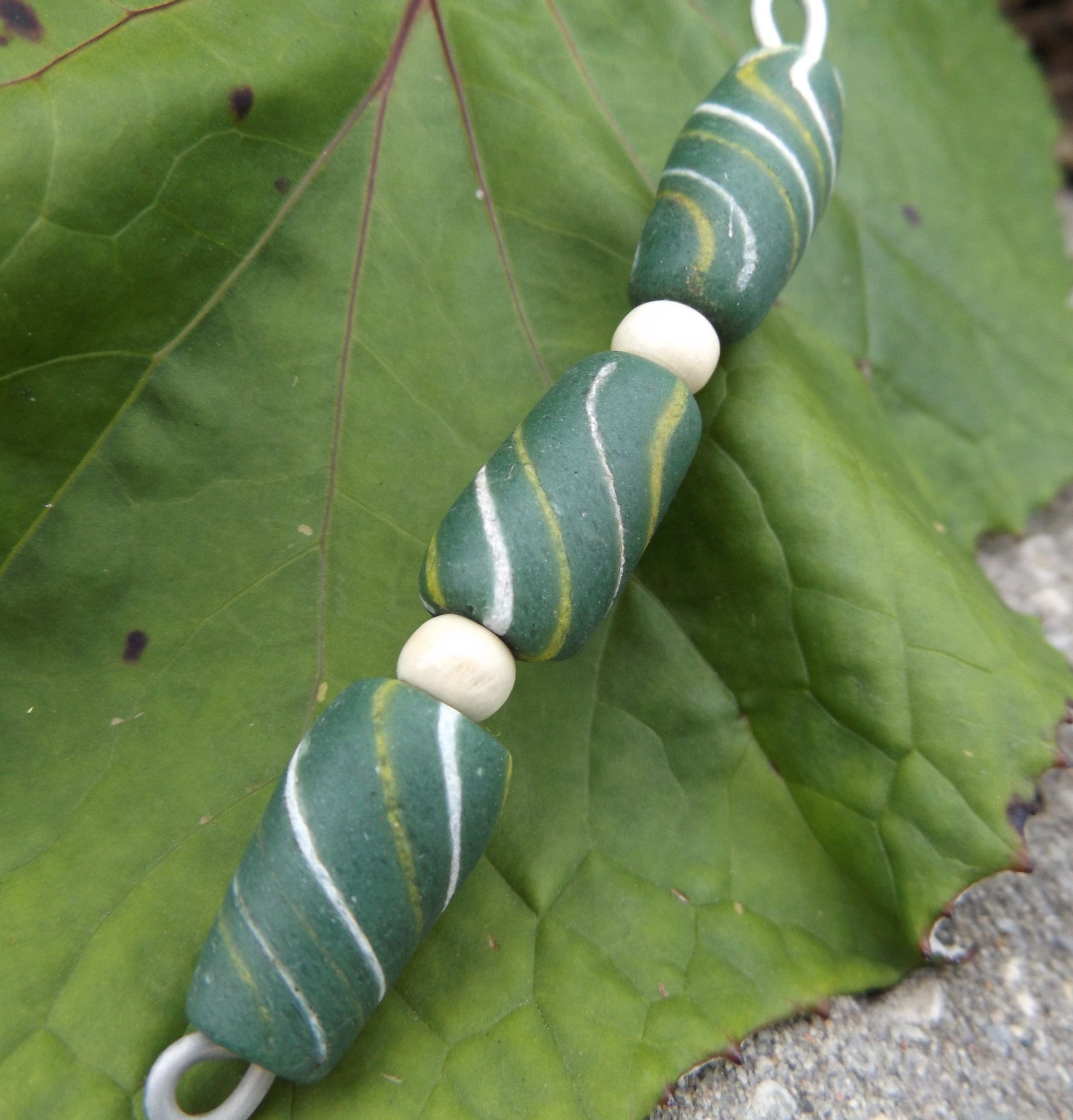 Sand Cast African Recycled Glass (Green Barrel with yellow and white swirls) *3 Beads