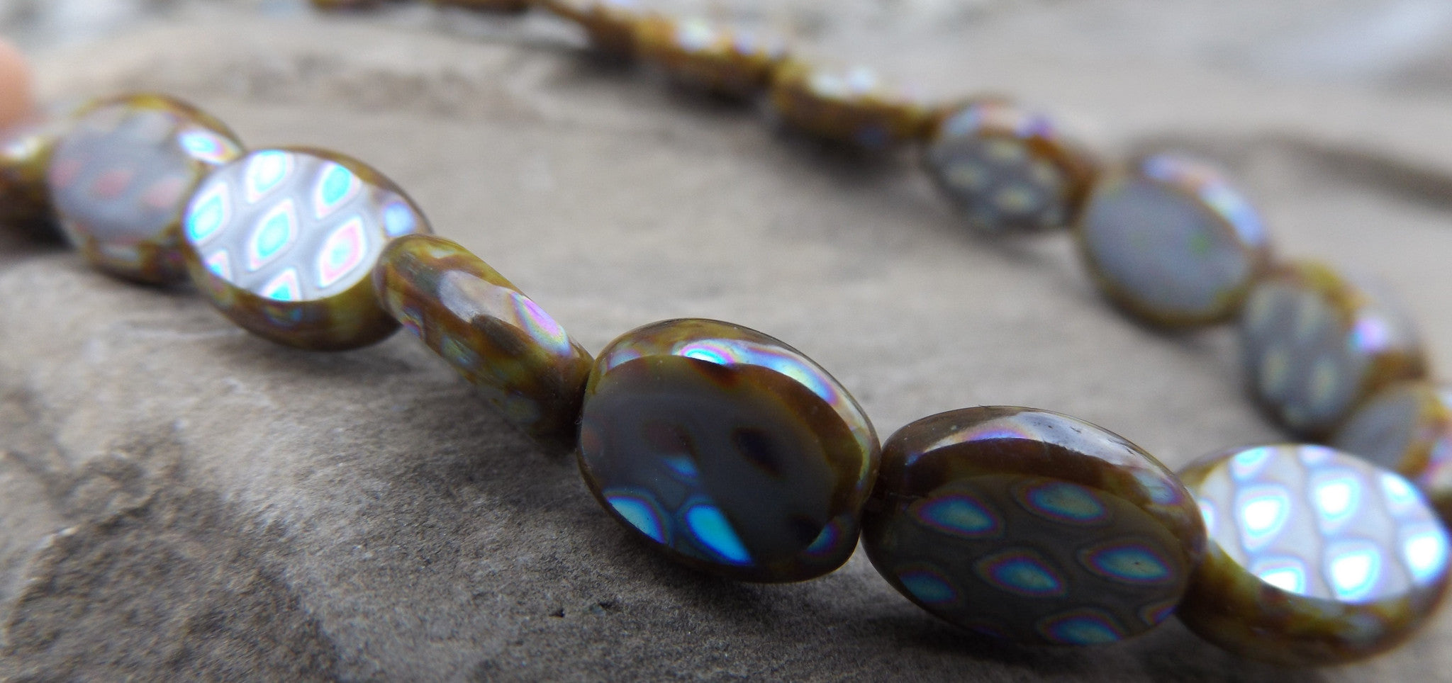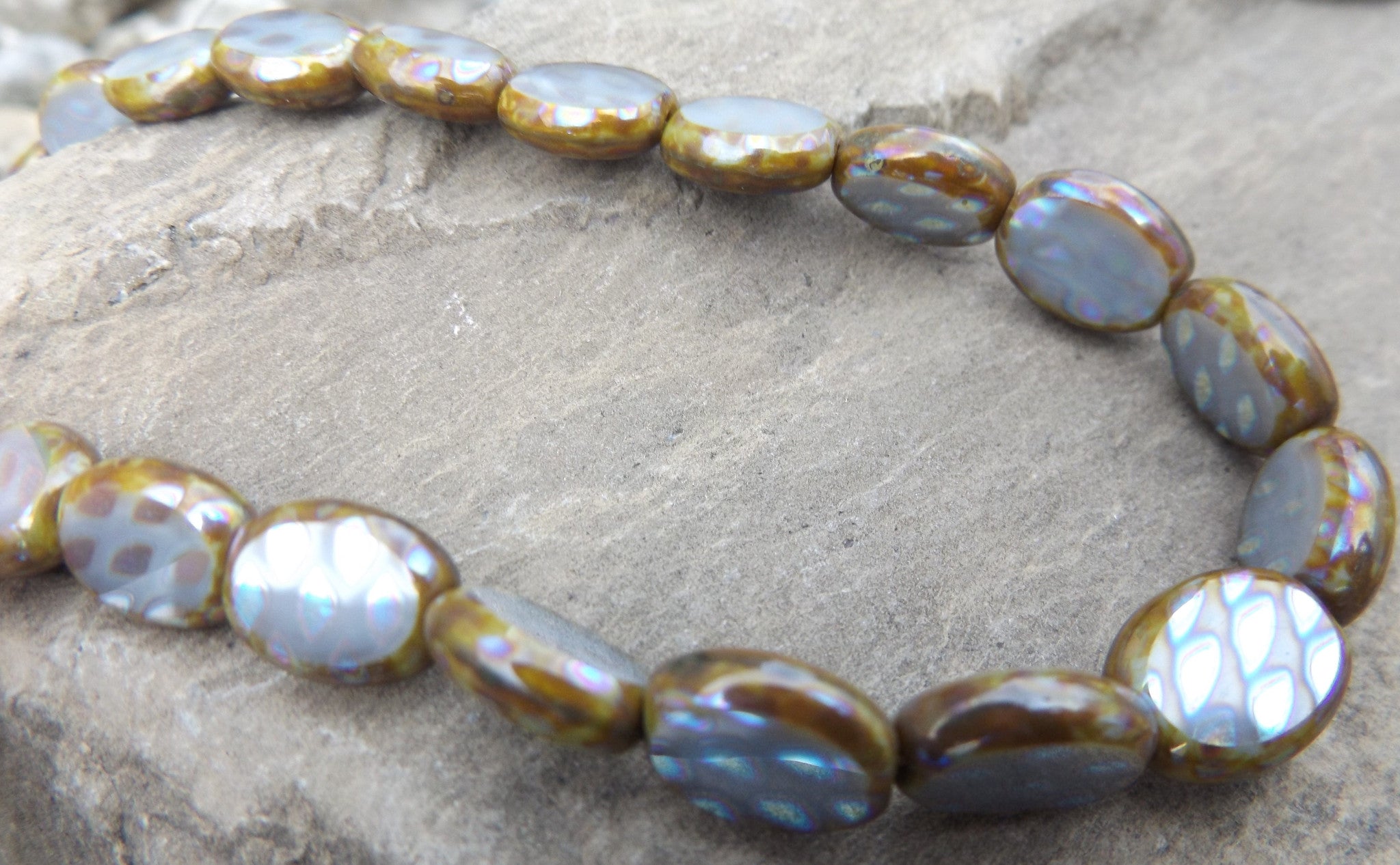 Czech Glass Oval Square (Natural Edge, Smoky Blue with Metallic Pattern) 9 x 10mm *10 Beads