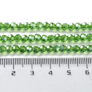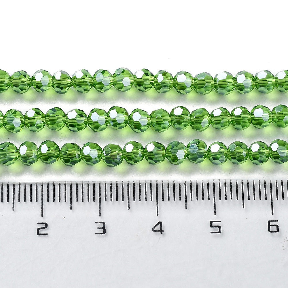 Electroplate Glass Bead Strands, Pearl Luster Plated, Faceted, Round, Green, 4mm. (approx 100 beads per 15" Strand)