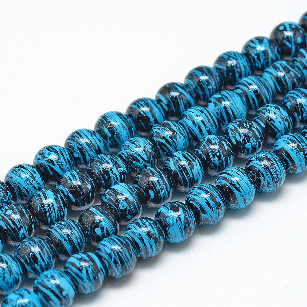 Glass (8mm) Round Black with Blue Splatter (approx 53 Beads per 16" Strand)