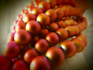 These glass beads are fantastic!  A store favorite!  Depending on the light... they pink or Orangy/ Red/Yellow !