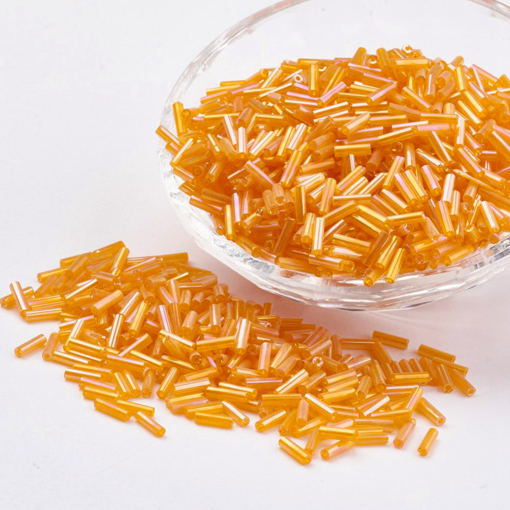 Glass Bugle Beads, Transparent Rainbow Coated- Orange, 6x2mm, Hole: 0.5mm. Approx 15 Grams