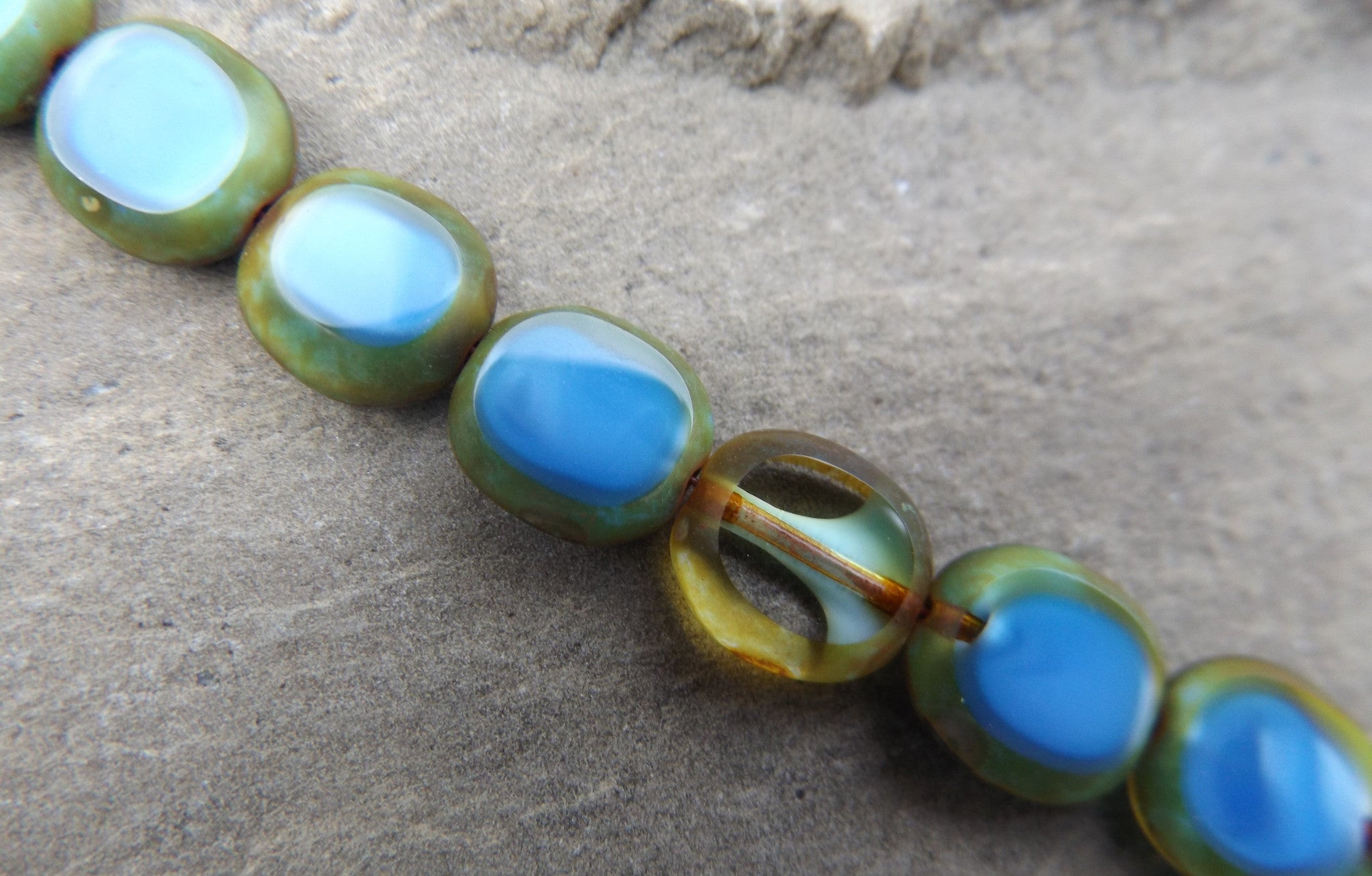 Czech Glass Oval Square (Blue and Tan Edging) 9 x 8 mm *12 Beads