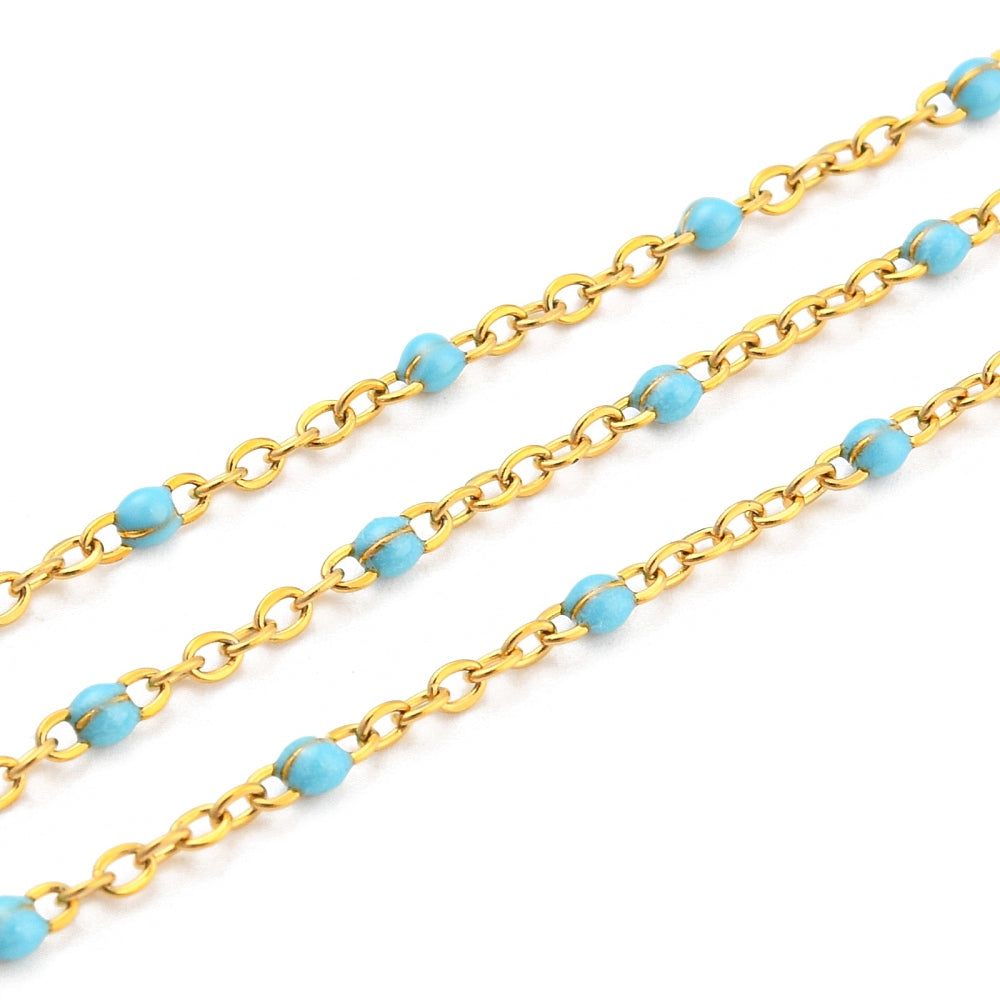 Hand Made Stainless Steel Chain. Soldered, Golden Color with Light Sky Blue Enamel Embellishment. 2 x 1.6 x 0.2mm. *Sold by the Foot
