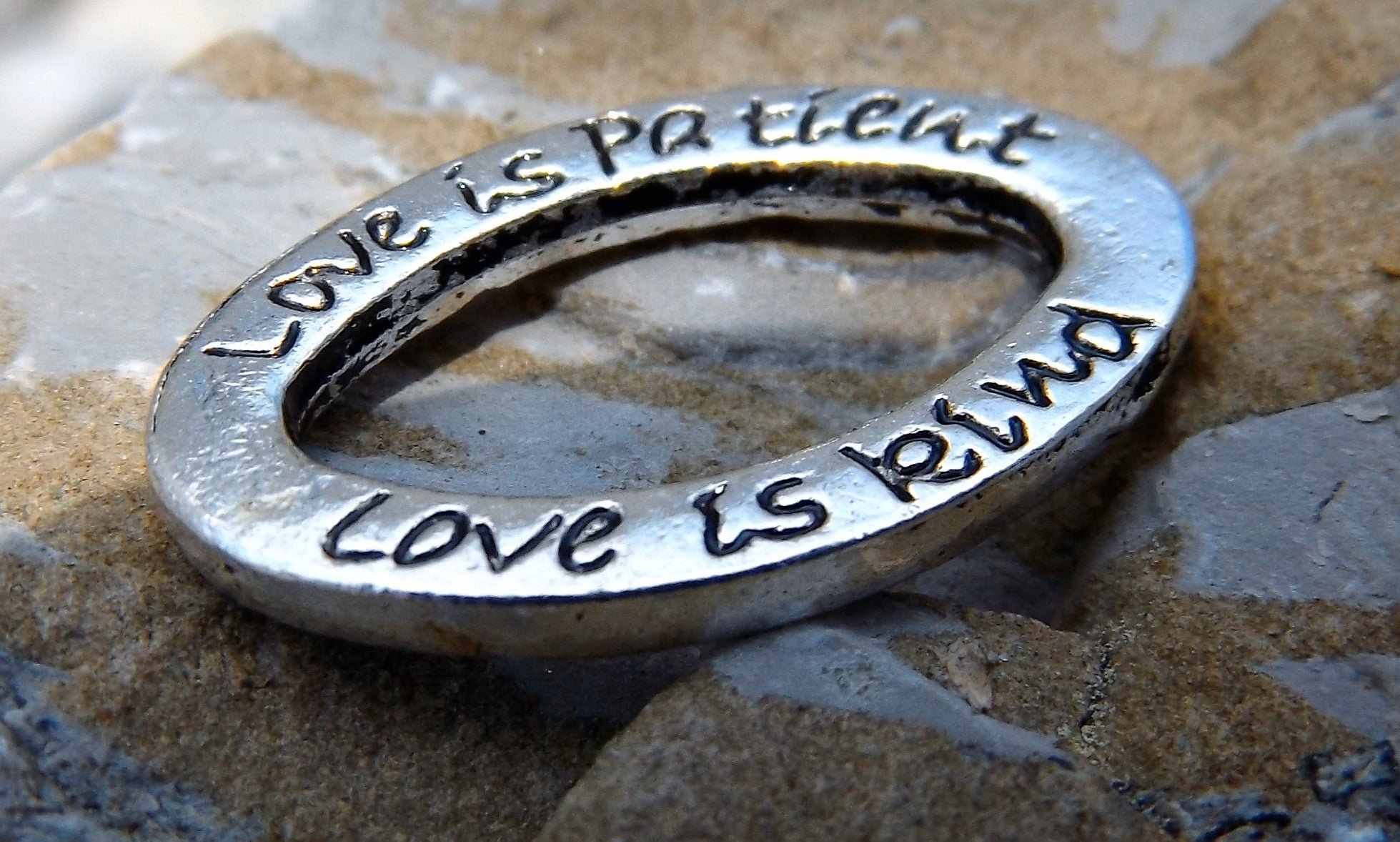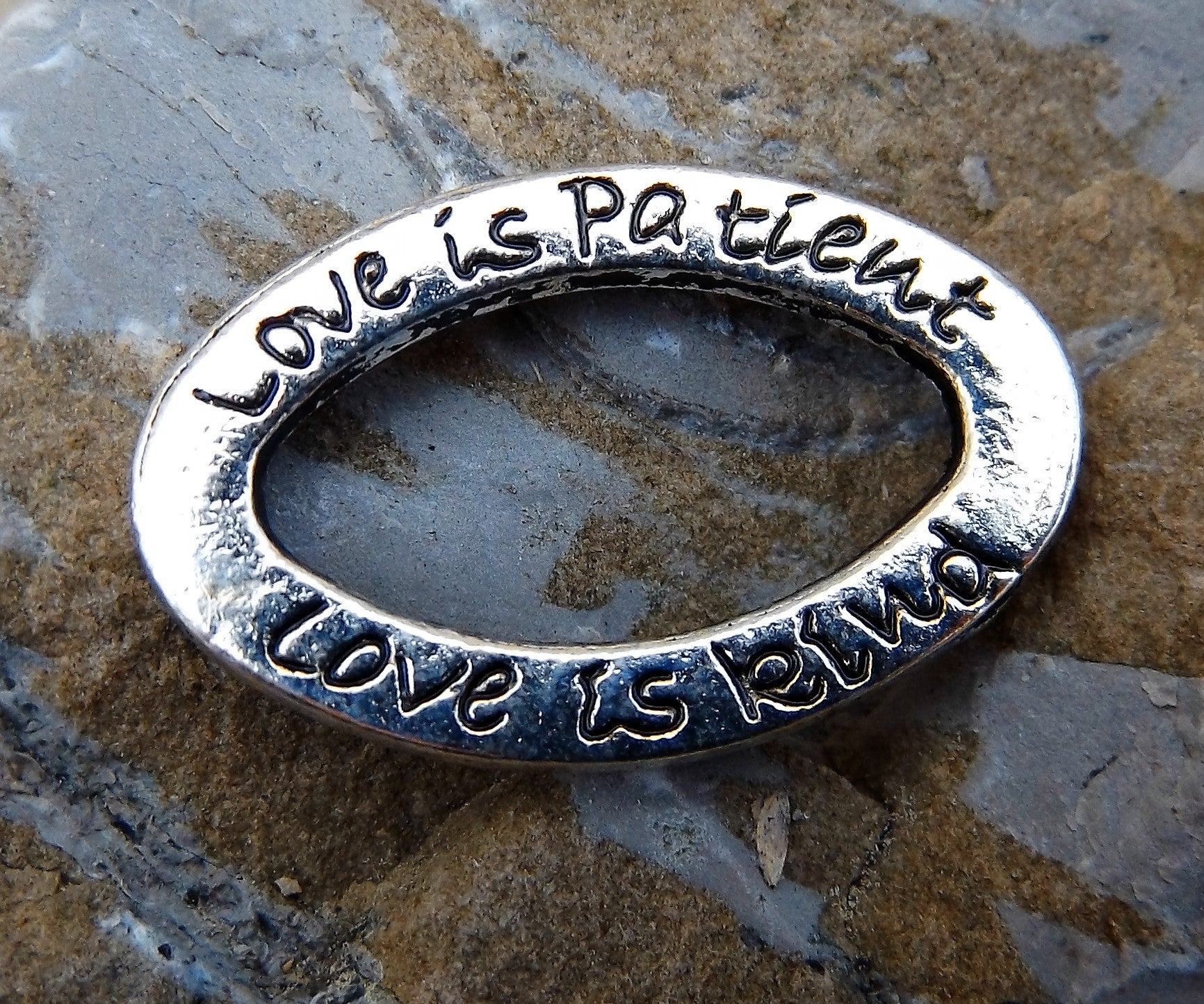 Link (Oval with the words: Love is Patient, Love is Kind"). Back side says: Love Never Fails.