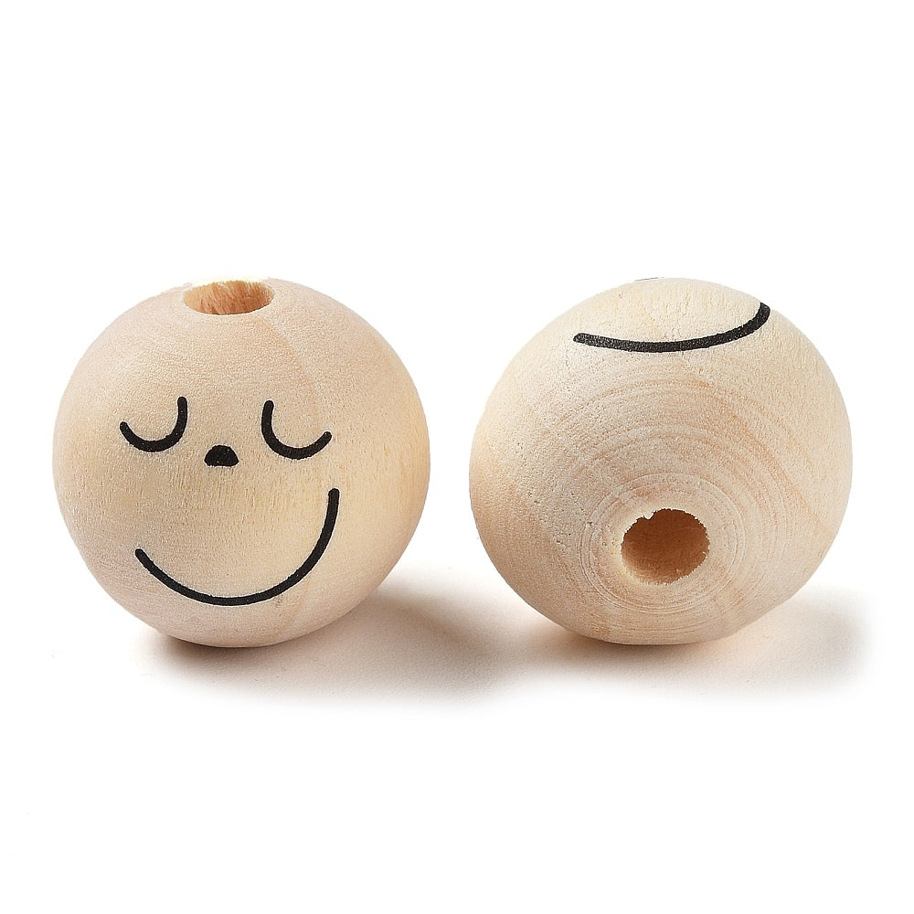 Printed Wood Beads, Round with Smiling Face, Undyed, Blanched Almond, 20mm, Hole: 2mm. (packed 10)