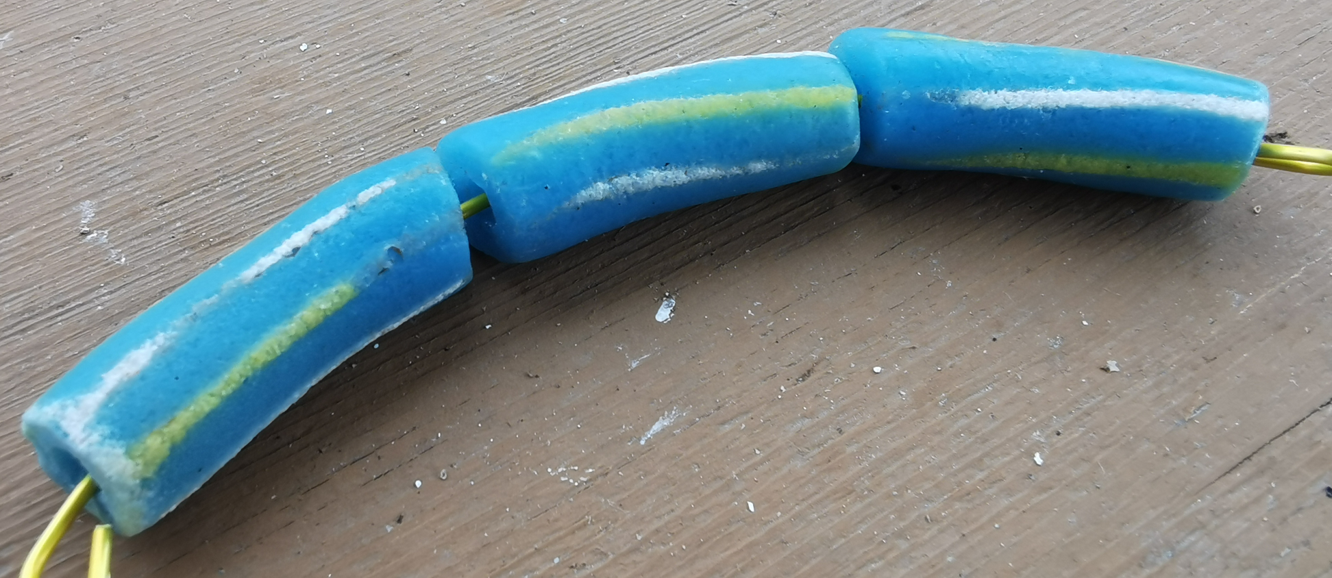 Sand Cast African Recycled Glass (Sky Blue Barrel with White and Yellow Lines) *3 Beads