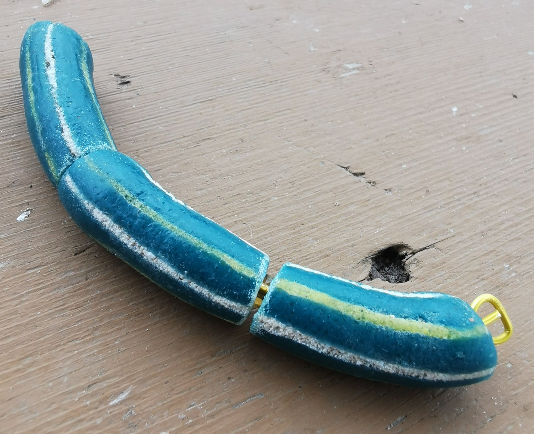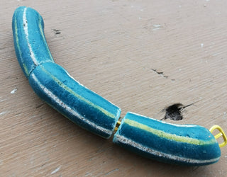 Sand Cast African Recycled Glass (Teal Greena Barrel with White and Yellow Lines) *3 Beads