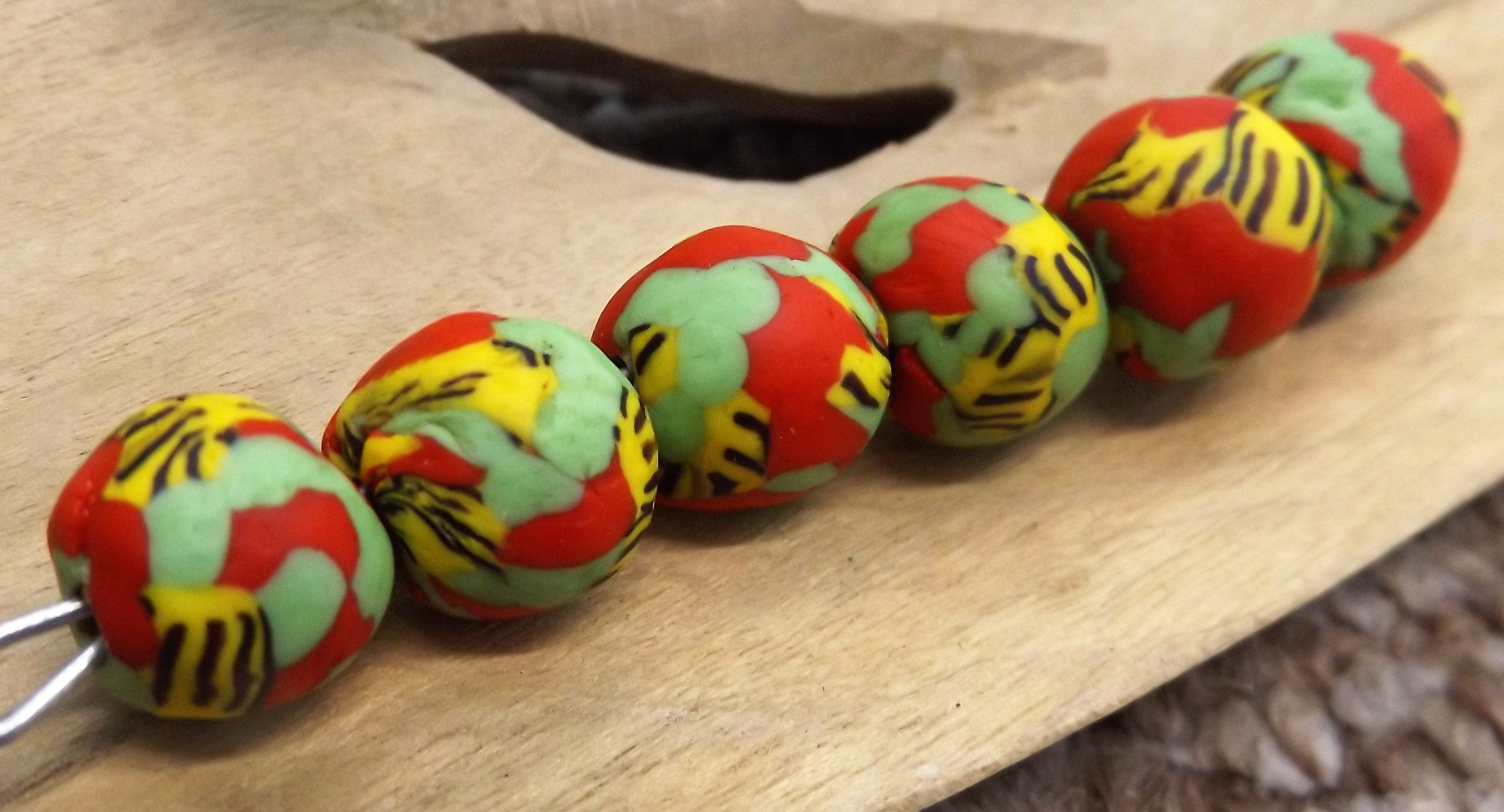 Sand Cast African Recycled Rounded Designed Glass (Red, Green and Yellow). *6 Beads