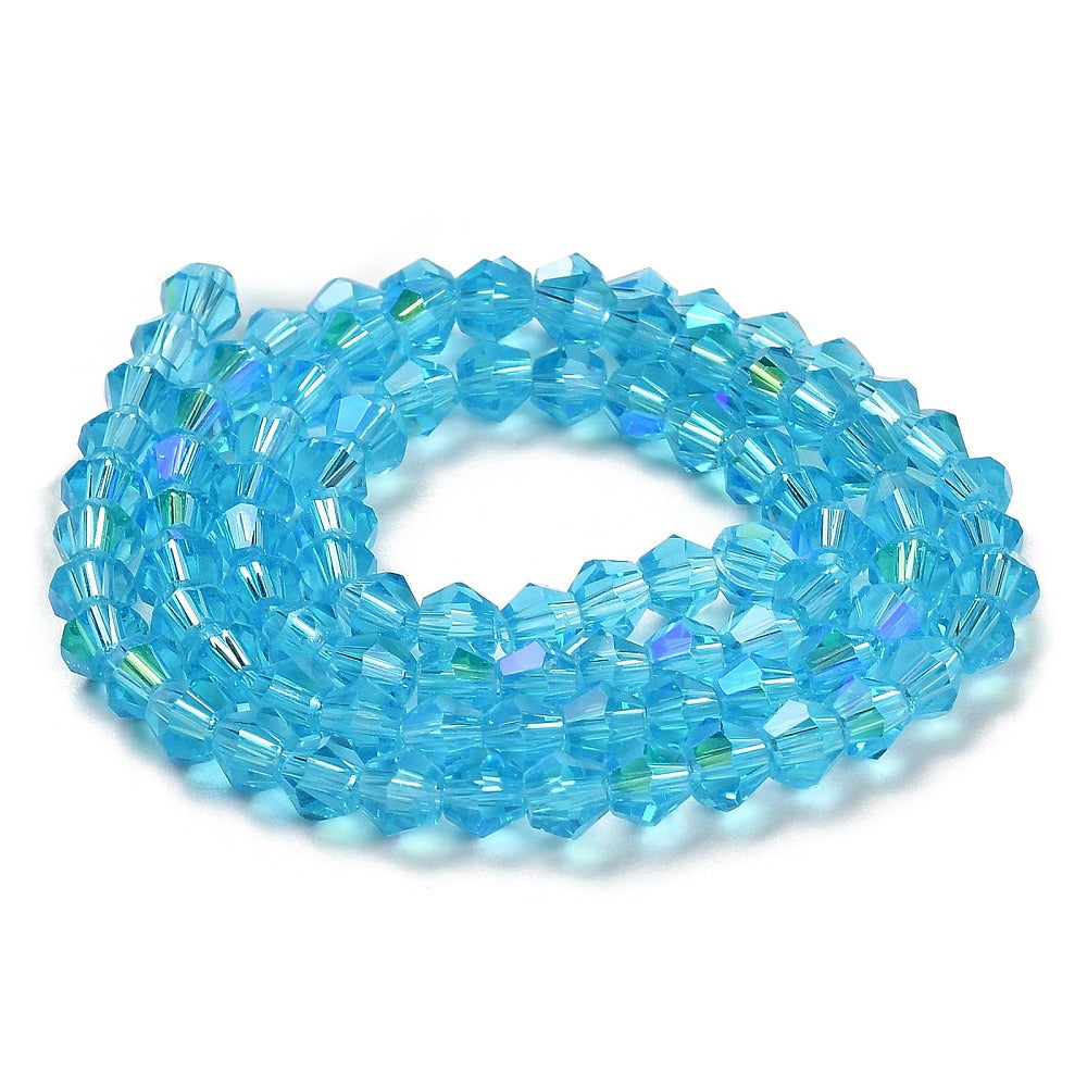 Transparent Electroplate Glass Beads Strands, AB Color Plated, Faceted, Bicone, Deep Sky Blue, 4x4mm, Hole: 0.8mm. *Approx 90 Beads.